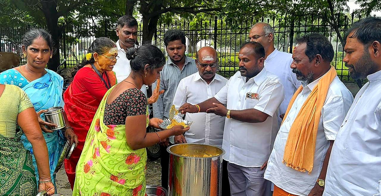 அன்னை கஸ்தூரிபாய் மாற்றுத்திறனாளிகள் சமூக சேவை அமைப்பு நிறுவன தலைவர் என்.ஆர். சுசிலா ஏற்பாட்டில் நடைபெற்ற இந்நிகழ்ச்சியில், ஏழை மக்கள் கழக நிறுவனர் பூக்கடை கமலக்கண்ணன் சிறப்பு அழைப்பாளராகக் கலந்துகொண்டு, ஏழை எளிய மக்களுக்கு உணவு வழங்கி அன்னதானத்தைத் தொடங்கி வைத்தார்.