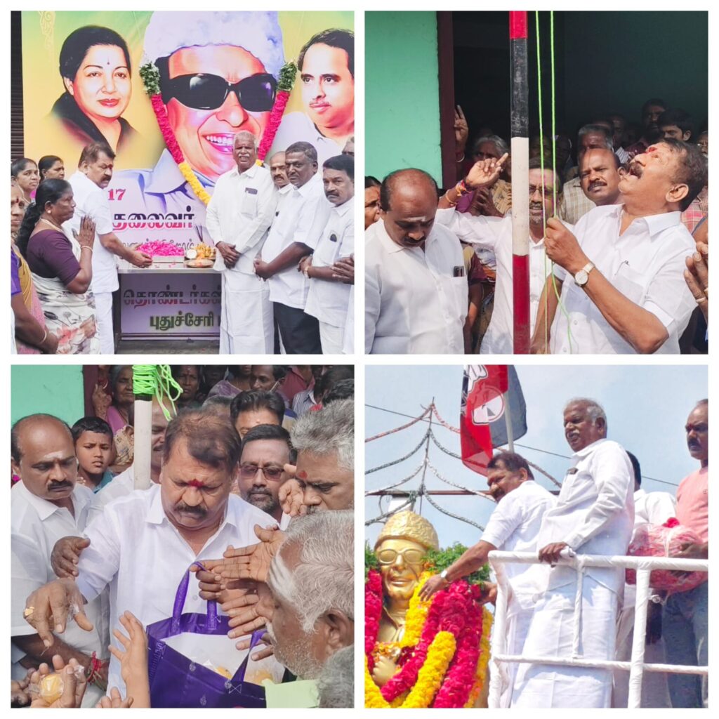புதுவை குயவர் பாளையம், லெனின் வீதி மாநிலக் கழக அலுவலகத்தில் நடைபெற்ற நிகழ்வில் அலங்கரித்து வைக்கப்பட்ட புரட்சித்தலைவர் அவர்களின் உருவப்படத்திற்கு மாநிலக் கழக செயலாளர் திரு. ஓம்சக்தி சேகர் அவர்கள் மலர் தூவி அஞ்சலி செலுத்தினார். தொடர்ந்து கழகக் கொடி ஏற்றப்பட்டு, பட்டாசுகள் வெடித்து இனிப்புகள் வழங்கப்பட்டன.