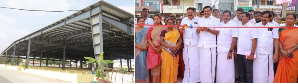 காங்கேயம் நகராட்சி, வாரச்சந்தை வளாகத்தில் கலைஞர் நகர்ப்புற மேம்பாட்டுத்திட்டத்தின் கீழ் ரூ.9.62 கோடி மதிப்பீட்டில் கட்டப்பட்டுள்ள தினசரி சந்தை கடைகள் மற்றும் வாரச்சந்தை கடைகளை தமிழ் வளா்ச்சி மற்றும் செய்தித்துறை அமைச்சா் மு.பெ.சாமிநாதன் திறந்து வைத்தார்.