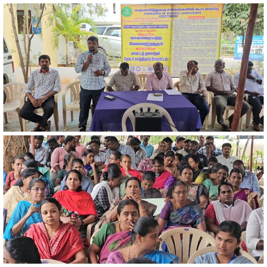 நில அளவைத் துறையில் வெளி முகமை ஒப்பந்த அடிப்படையில் ஆன பணி நியமனங்களை கைவிட வேண்டும், வருவாய் மற்றும் பேரிடர் மேலாண்மை துறையின் அனைத்து காலிப் பணியிடங்களையும் காலமுறை ஊதியத்தில் நிரப்ப வேண்டும், கிராம நிர்வாக அலுவலர்கள் கிராமங்களிலேயே தங்கி பணிபுரிய வேண்டும் என்பதை தளர்த்த வேண்டும் அவர்களின் வட்ட எல்லைக்குள் தங்கி பணிபுரியும் வகையில் விதிகளை திருத்த வேண்டும் உள்ளிட்ட ஒன்பது அம்ச கோரிக்கைகளை வலியுறுத்தி போராட்டம் நடைபெறுகிறது.