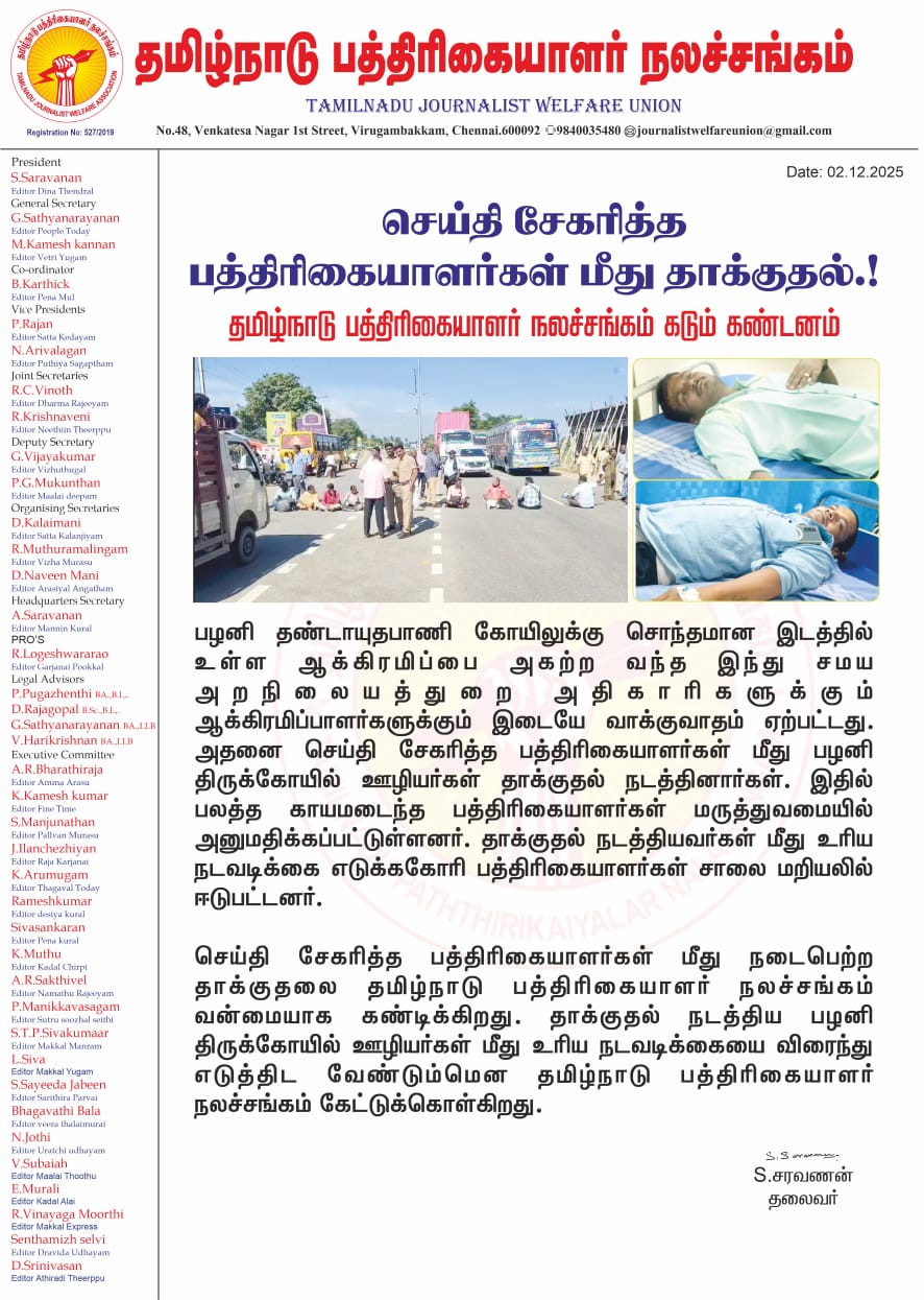 செய்தி சேகரித்த பத்திரிகையாளர்கள் மீது நடைபெற்ற தாக்குதலை தமிழ்நாடு பத்திரிகையாளர் நலச்சங்கம் வன்மையாக கண்டிக்கிறது. தாக்குதல் நடத்திய பழனி திருக்கோயில் ஊழியர்கள் மீது உரிய நடவடிக்கையை விரைந்து எடுத்திட வேண்டும்மென தமிழ்நாடு பத்திரிகையாளர் நலச்சங்கம் கேட்டுக்கொள்கிறது.