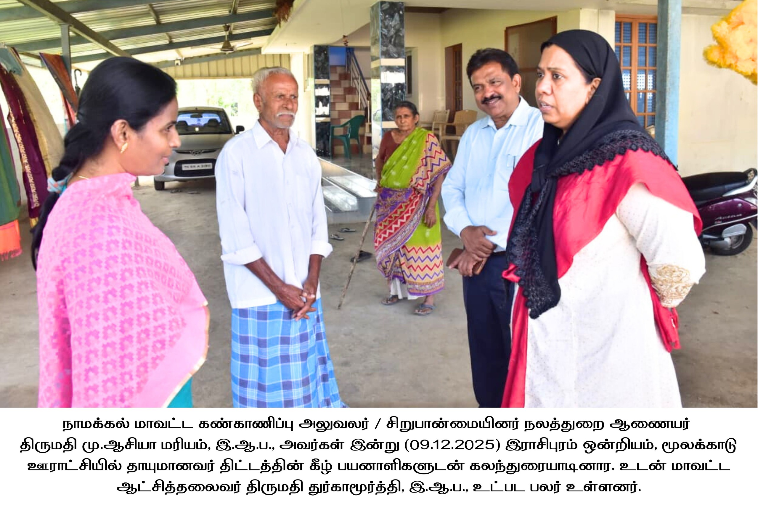மேலும், முதலமைச்சரின் தாயுமானவர் திட்டத்தின் கீழ் வீடுகளுக்கு நேரடியாக ரேசன் பொருட்கள் வழங்குதல் தொடர்பாக திருச்செங்கோடு நகராட்சி வ.மோர்பாளையம், வெண்ணந்தூர் பேரூராட்சி மசக்காளிப்பட்டி, சேந்தமங்கலம் பேரூராட்சி வடுகபட்டி ஆகிய பகுதிகளில் நேரடியாக பயனாளிகளின் வீடுகளுக்கு சென்று கலந்துரைடியாடினார்.