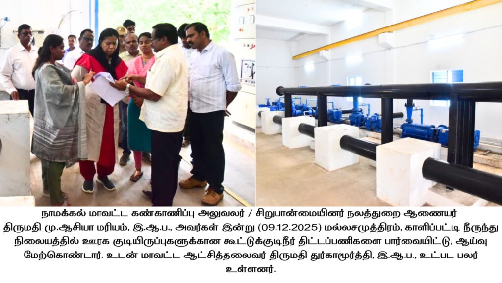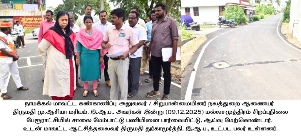 நாமக்கல் மாவட்ட கண்காணிப்பு அலுவலர் / சிறுபான்மையினர் நல ஆணையர் திருமதி மு.ஆசியா மரியம், இ.ஆ.ப., அவர்கள் பள்ளிபாளையம் நகராட்சியில் அம்ரூத் 2.0 திட்டத்தின் கீழ் ரூ.1.78 கோடி மதிப்பீட்டில் மேற்கொள்ளப்பட்டு வரும் குடிநீர் மேம்பாட்டு பணியினையும், திருச்செங்கோடு நகராட்சியில் ரூ.51.5 இலட்சம் மதிப்பீட்டில் நகர்ப்புற சாலை மேம்பாட்டுத் திட்டத்தின் கீழ் சாலை மேம்பாட்டு பணியினையும், மல்லசமுத்திரம் பேரூராட்சியில் ரூ.1.42 கோடி மதிப்பீட்டில் வார்டு எண்.7 சின்னகொல்லப்பட்டி காட்டுகோட்டை முதல் பாலிக்காடு, வார்டு எண்.11 திருநகர் காலனி பகுதிகள், வார்டு எண்.13 வையப்பமலை சாலை சிவசுப்ரமணியம் ஆசிரியர் இல்லம், வார்டு எண்.15 பருத்திப்பள்ளி சாலை சர்ச் லேன் பகுதி, வார்டு எண்.15, ஏரிக்காடு சமுதாய கூடம் ரோடு ஆகிய பகுதிகளில் தார் சாலை அமைக்கும் பணியினையும், தமிழ்நாடு குடிநீர் வடிகால் வாரியம் சார்பில் ஒருங்கிணைந்த குடிநீர் வழங்கும் திட்டத்தின் கீழ் ரூ.8.41 கோடி மதிப்பீட்டில் நாமகிரிப்பேட்டை, பட்டணம், சீராப்பள்ளி, ஆர்.புதுப்பட்டி, வெண்ணந்தூர், பிள்ளாநல்லூர், ஆதனூர், மல்லசமுத்திரம் பேரூராட்சிகள், ராசிபுரம், புதுச்சத்திரம், வெண்ணந்தூர், நாமகிரிப்பேட்டை ஒன்றியங்களில் உள்ள 424 குடியிருப்புகள், உள்கட்டமைப்பு வசதிகளுடன் புதுச்சத்திரம் ஒன்றியத்தில் 99 மல்லசமுத்திரம், எலச்சிபாளையம் மற்றும் பரமத்தியில் உள்ள 11 ஊராட்சிகளில் உள்ள 547 குடியிருப்புகளுக்கான கிராமப் பகுதிகள்) குடிநீர் திட்டப் பணிகளையும், வெண்ணந்தூர் பேரூராட்சியில் சிறப்பு நிதியின் கீழ் ரூ.74.00 இலட்சம் மதிப்பீட்டில் தார்சாலை அமைக்கும் பணியினையும், பிள்ளாநல்லூர் பேரூராட்சியில் ரூ.49.00 இலட்சம் மதிப்பீட்டில் அயோத்தி தாசர் பண்டிதர் குடியிருப்பு மேம்பாட்டுத் திட்டத்தின் கீழ் கழிநீர் வடிகால் மற்றும் சாலை பலப்படுத்தும் பணியினையும் பார்வையிட்டு ஆய்வு மேற்கொண்டார்.