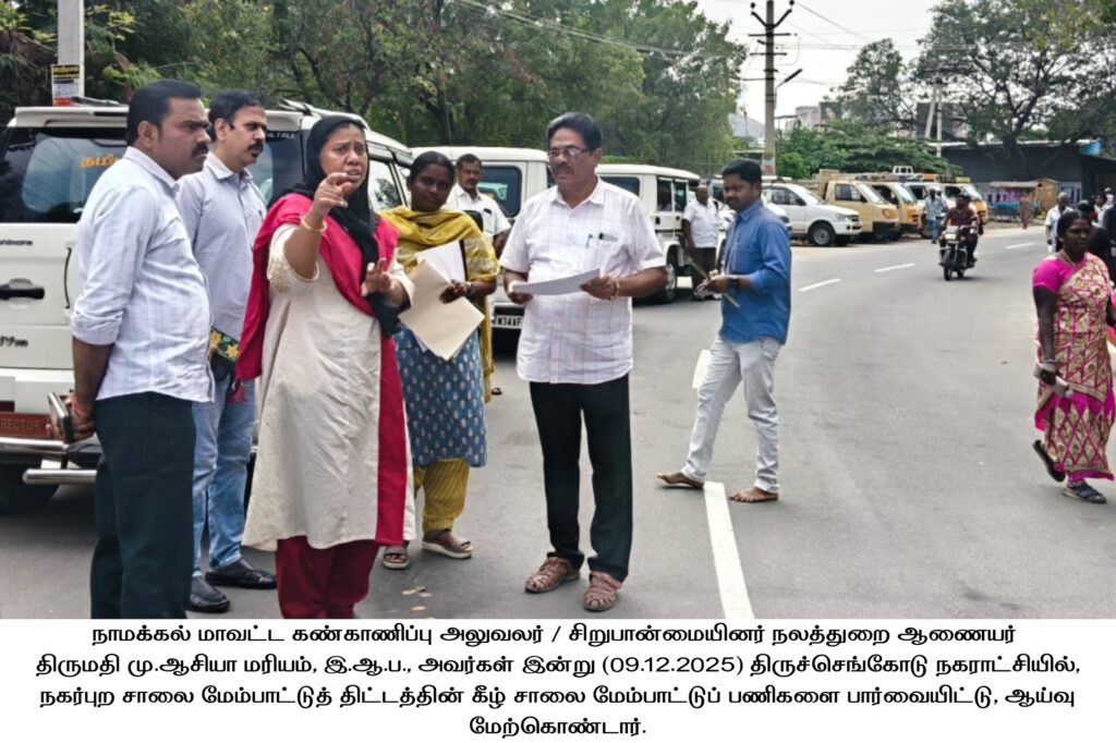 நாமக்கல் மாவட்டம், பள்ளிபாளையம், திருச்செங்கோடு, இராசிபுரம் நகராட்சிகள் மற்றும் மல்லசமுத்திரம், வெண்ணந்தூர், பிள்ளாநல்லூர், சேந்தமங்கலம் பேரூராட்சிகளுக்குட்பட்ட பகுதிகளில் இன்று (09.12.2025) மாவட்ட கண்காணிப்பு அலுவலர் / சிறுபான்மையினர் நல ஆணையர் திருமதி மு.ஆசியா மரியம், இ.ஆ.ப., அவர்கள், மாவட்ட ஆட்சித்தலைவர் திருமதி துர்காமூர்த்தி, இ.ஆ.ப., அவர்கள் முன்னிலையில், ரூ.24.67 கோடி மதிப்பீட்டில் மேற்கொள்ளப்பட்டு வரும் பல்வேறு வளர்ச்சித் திட்டப்பணிகளை, செய்தியாளர்களுடன் நேரில் பார்வையிட்டு, ஆய்வு மேற்கொண்டார்.