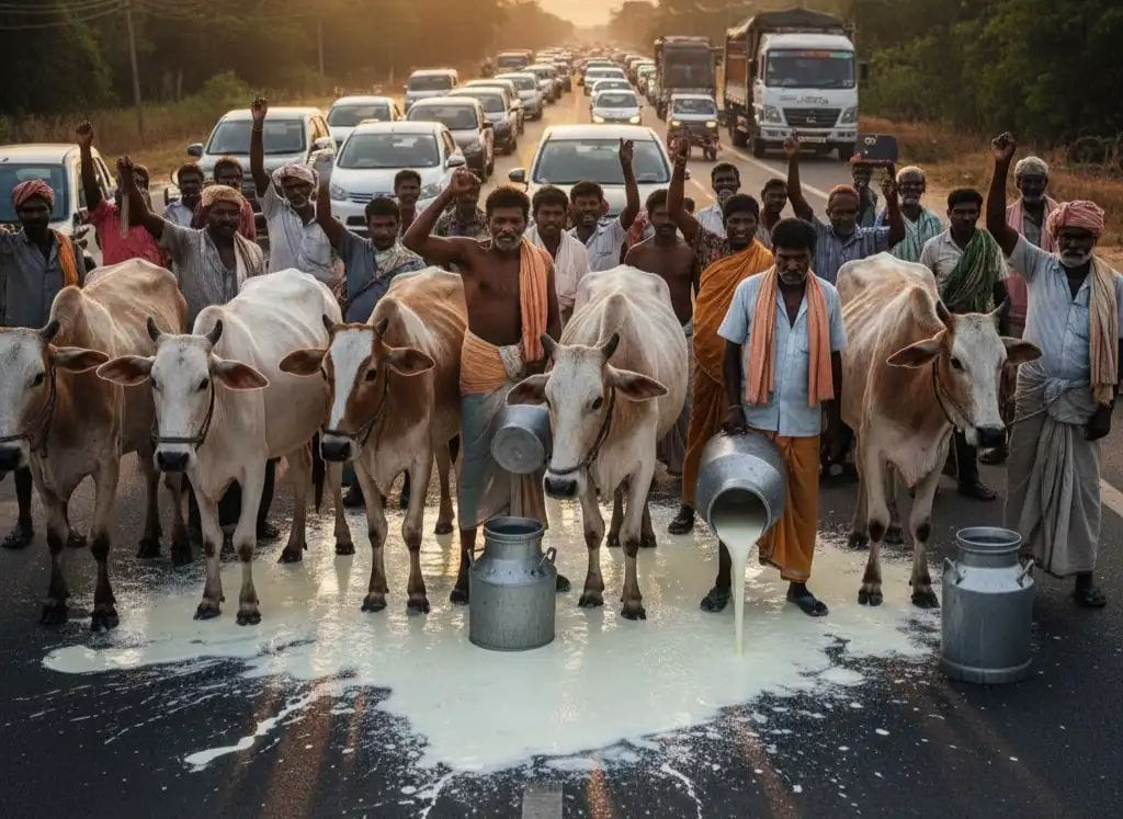 கால்நடை தீவனங்களின் விலை முன்னெப்போதும் இல்லாத வகையில் 40% வரை உயர்ந்துள்ள நிலையில், வாழ்வாதாரத்தை இழந்து தவிக்கும் நூற்றுக்கணக்கான விவசாயிகள் தங்கள் கறவை மாடுகளுடன் சாலை மறியலில் குதித்தனர். ஆத்திரமடைந்த விவசாயிகள், தாங்கள் கஷ்டப்பட்டு கறந்த பாலை சாலையில் ஊற்றி அரசுக்கு எதிராகக் கோஷமிட்டது அந்தப் பகுதியில் பெரும் பரபரப்பை ஏற்படுத்தியது.