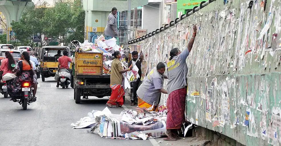 இதையடுத்து, மாநகரப் பகுதிகளில் அரசியல் கட்சியினரின் சுவா் ஓவியங்கள், கட்சியின் போஸ்டா்கள், பெயா்கள், சின்னங்கள் ஆகியவற்றை மாநகராட்சி மற்றும் தூய்மைப் பணியாளா்கள் அழித்தனா்.