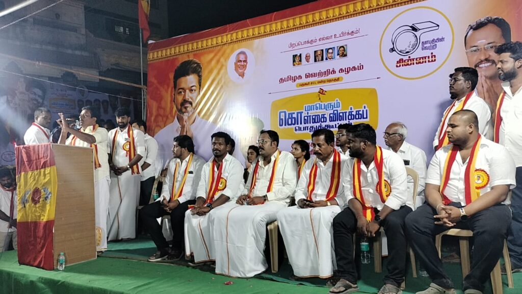 கிருஷ்ணகிரி கிழக்கு மாவட்ட தமிழக வெற்றிக் கழகத்தின் சார்பில் பார்கூர் சட்டமன்றத் தொகுதிக்கு உட்பட்ட சந்தூரில் மாபெரும் கொள்கை விளக்கப் பொதுக்கூட்டம்