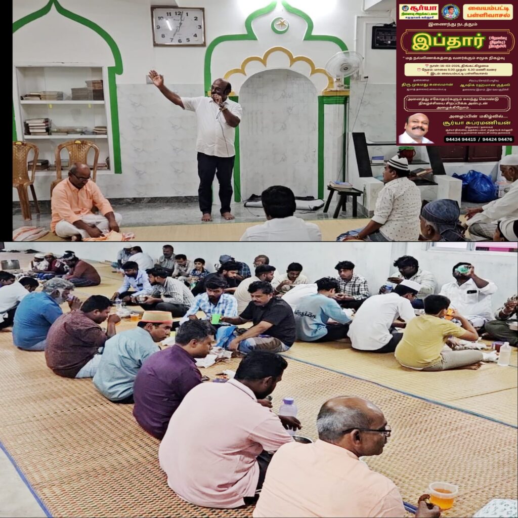 திருச்சி மாவட்டம் வையம்பட்டியில் உள்ள பள்ளிவாசலில் புனித ரமலான் நோன்பு திறக்கும் இஃப்தார் விருந்து சூர்யா நினைவு அறக்கட்டளை சார்பில் நடைபெற்றது.