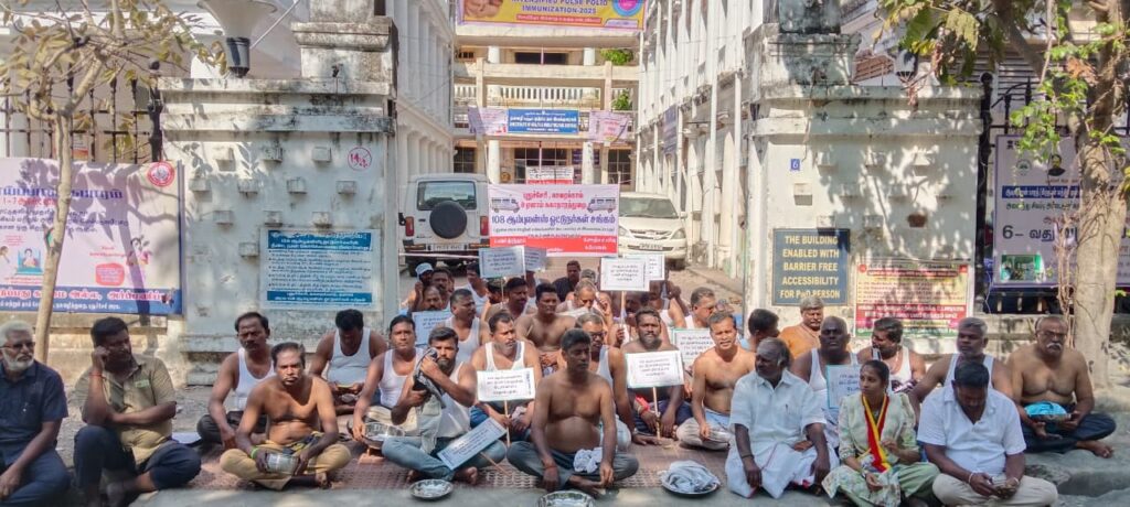 கடந்த 10 நாட்களாக சுகாதாரத் துறை அலுவலகம் முன்பாக முழக்கங்களை எழுப்பி போராடி வந்த ஊழியர்கள், இன்று 12-வது நாளில் தங்கள் கோரிக்கைகளை வலியுறுத்தி அரை நிர்வாணமாக பிச்சை எடுக்கும் போராட்டத்தை முன்னெடுத்தனர். “வாழ்வாதாரத்திற்காக வேறு வழியின்றி இந்த முடிவை எடுத்துள்ளோம்” என அவர்கள் வேதனையுடன் தெரிவித்தனர்.