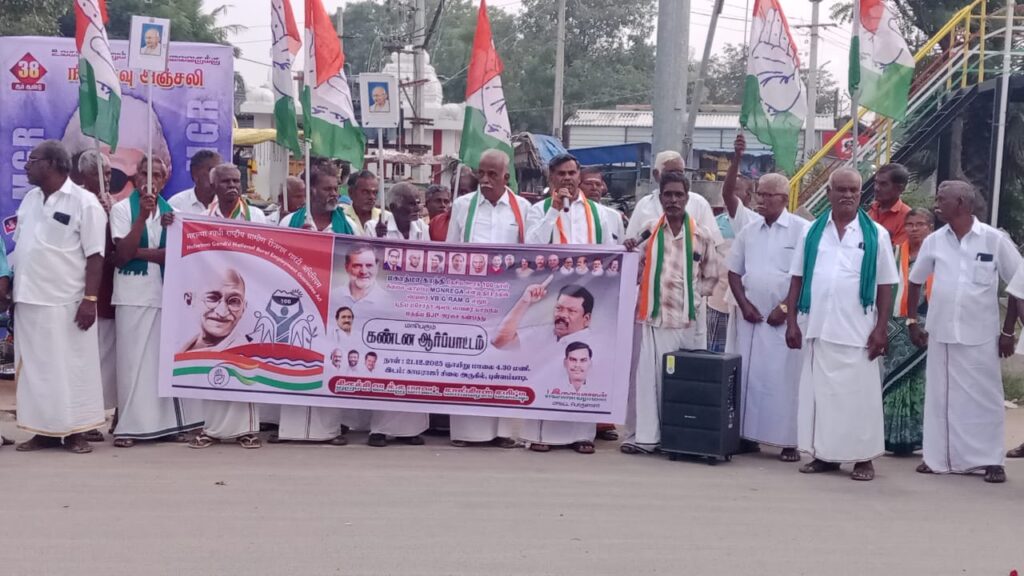 திருச்சி மாவட்டம் , புள்ளம்பாடியில் இந்திய தேசிய காங்கிரஸ் திருச்சி வடக்கு மாவட்டம் சார்பாக மகாத்மா காந்தி தேசிய ஊரக 100 நாள் வேலைவாய்ப்பு திட்டத்தில் பிஜேபி மோடி மத்திய அரசு மகாத்மா காந்தியின் பெயரை நீக்கி (MGNREGA) திட்டத்தின் பெயரை (VB G RAM G )என்று பெயர் மாற்றம் செய்து உள்ளதை கண்டித்து மாபெரும் கண்டன ஆர்ப்பாட்டமானது புள்ளம்பாடி காமராஜர் சிலை அருகில் நடைபெற்றது இந்த ஆர்ப்பாட்டத்தில் மாவட்ட பொருளாளர் திருச்சி இளையராஜன் எழுச்சி உரையாற்றி தலைமை தாங்கினார், மாவட்ட வர்த்தக பிரிவு தலைவர் ரெங்கராஜன் முன்னிலை வகித்து வரவேற்பு உரையாற்றினார், மாவட்ட sc துறை தலைவர் சிவசாமி கண்டனம் முழக்கங்கள் எழுப்பினார், புள்ளம்பாடி வட்டாரத் தலைவர் தங்கவேலு, பெருவளப்பூர் ஜெகதீசன், வாண்டர்பாளையம் சோமு, மேலவாளாடி அப்துல் காதர் ஆகியோர் சிறப்புரையாற்றினர், புள்ளம்பாடி கணபதி நன்றியுரை ஆற்றினார், மேலும் சிறப்பாளர்களாக லால்குடி வட்டார தலைவர் சுப்பிரமணியன், தப்பாய் ராஜரத்தினம் ராஜா, முன்னாள் கவுன்சிலர் அமுல்ராஜ், வெள்ளநூர் குழந்தைசாமி ஆரோக்கியசாமி, மகிலா காங்கிரஸ் அகிலா பால், சிறுகலப்பூர் செல்வராஜ், தாப்பாய் அறிவழகன் N.செல்வராஜ், வரகுப்பை குணசேகரன், ஆலம்பாக்கம் காந்தி செல்வராஜ், ஆலம்பாடி குணசேகரன், கள்ளகம் கிருஷ்ணன், s.அசோக்குமார், ராஜா விஸ்வநாதன் பரமசிவம் செல்வராஜ் பஞ்சாட்சரம், s m மணி, கோவிந்தராஜ் ஆறுமுகம், ரங்கராஜ், மாரிமுத்து, புள்ளம்பாடி s c துறை மாரிமுத்து நேரு, பெருலாப்பூர் ஜெகதீசன் அரசப்பன், குமுலூர் பழனிச்சாமி ஜோசப், மகளிர் மகேஸ்வரி ரேவதி மாலதி அனிதா துர்கா ராசாமணி ,தன பாக்கியம் வள்ளி லலிதா லீலாவதி மருதாயி கௌரி மற்றும் காங்கிரஸ் பெரியக்கத் தொண்டர்கள் சுமார் 100 பேர் கலந்து கொண்டனர்.