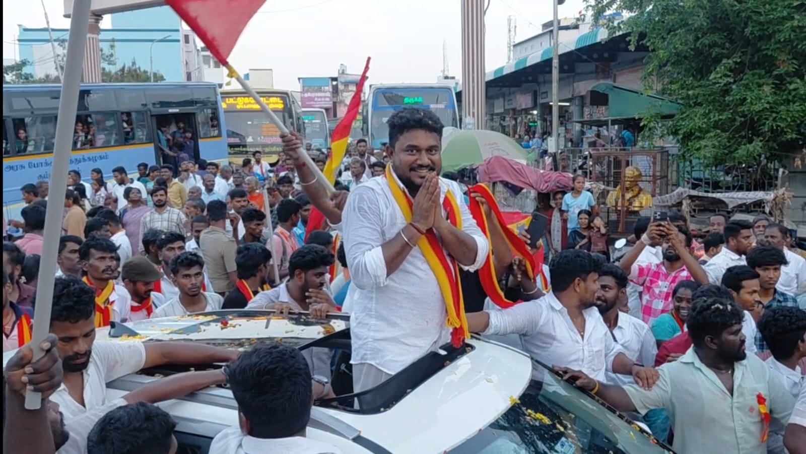 இந்நிலையில் இன்று சென்னையில் இருந்து ரயில் மூலம் மணப்பாறை தொகுதிக்கு வருகை தந்த தமிழக வெற்றி கழக வேட்பாளர் ஆர். கதிரவனுக்கு கட்சியினர் பட்டாசு வெடித்து மேளதாளங்கள் முழங்க விசில் ஊதி ரயில் நிலையத்திலிருந்து ஊர்வலமாக புறப்பட்டு பெரியார் சிலைக்கு மாலை அணிவித்து அதன் பின்னர் நகரின் முக்கிய வீதிகளின் வழியாக காமராஜர் சிலை வரை சென்று பின்னர் மஸ்தான் தெருவில் உள்ள த.வெ க மாவட்ட அலுவலம் வரை உற்சாக வரவேற்பு அளித்தனர்.