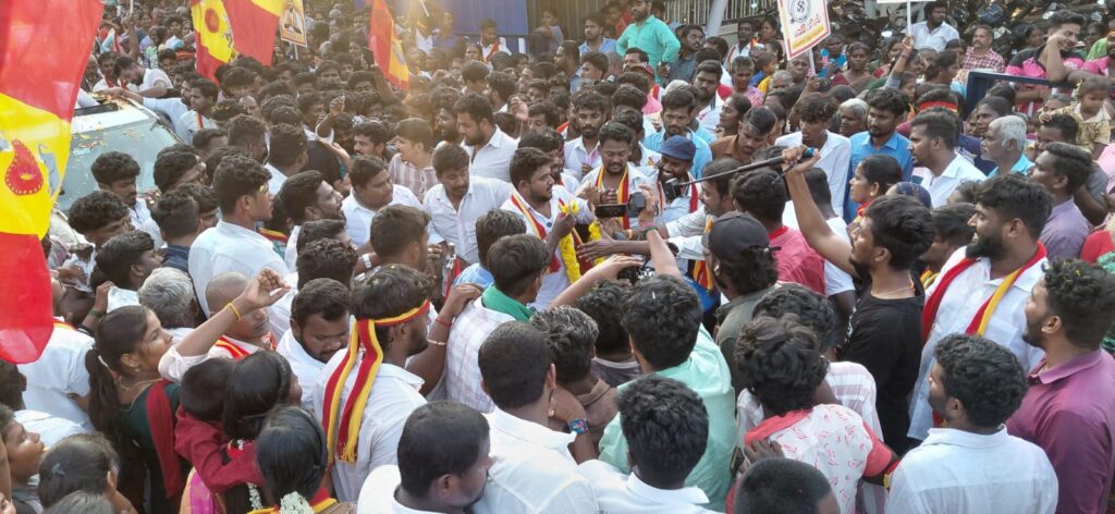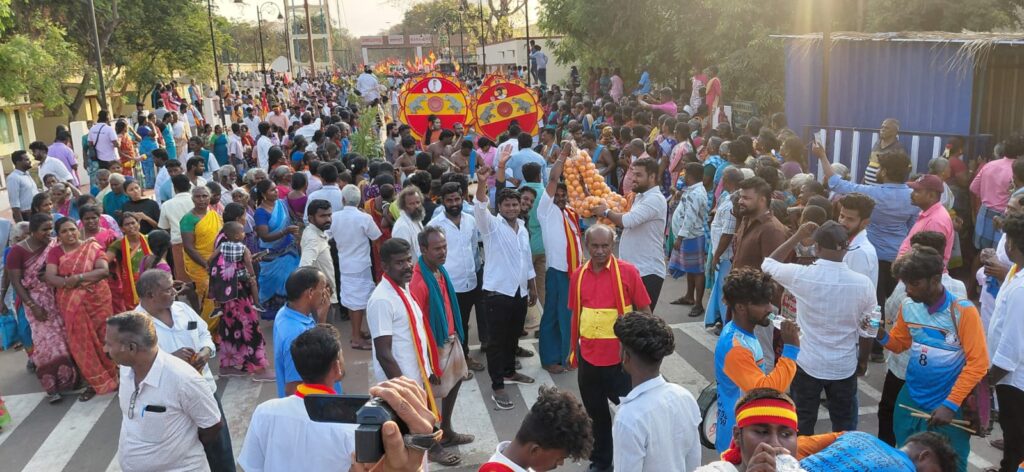 மேலும் வருகை தந்த வேட்பாளர் கதிரவனுக்கு மணப்பாறை நகர த வெக சார்பில் ஆரன்ச் பழம் மாலை அணிவித்தும் கேரளா சென்டை மேளம் முழங்க பல்லாயிரகணக்கான மக்கள் மத்தியில் ஊர்வலமாக அழைத்து வந்தனர்.