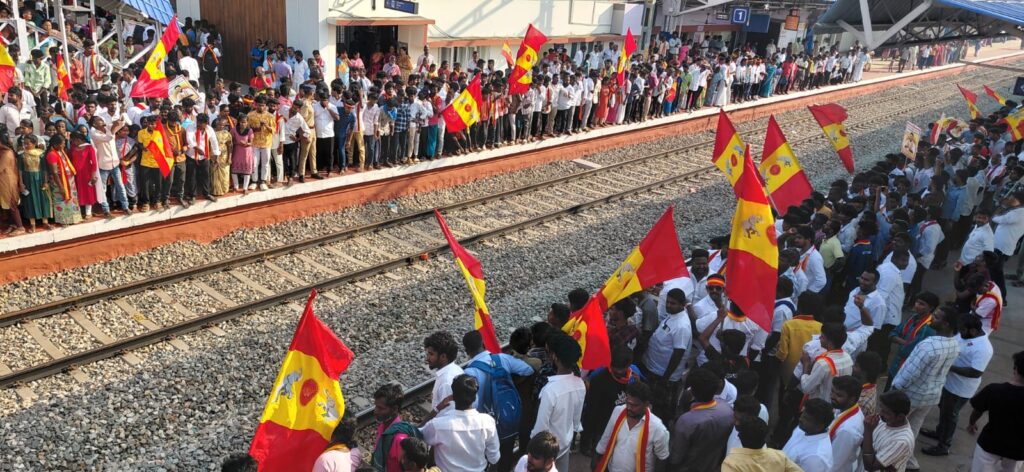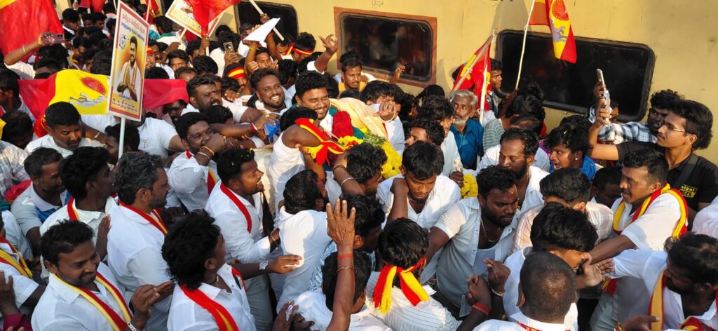 மணப்பாறை சட்ட மன்ற தொகுதி தமிழக வெற்றி கழக வேட்பாளர் ஆர் கதிரவனுக்கு இரயில் நிலையத்தில் உற்சாக வரவேற்பு அளித்த தவெ க வினர்..