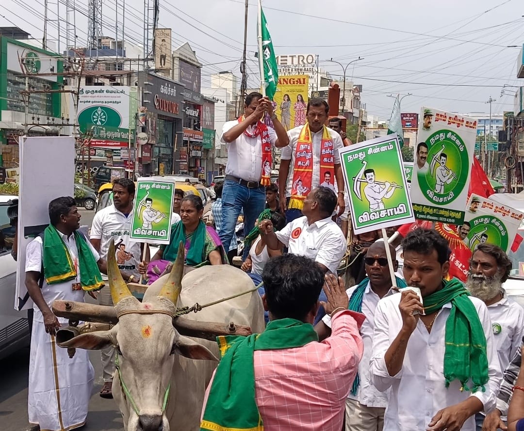 மாட்டு வண்டியில் வந்து வேட்பு மனு தாக்கல் செய்த நா த க வேட்பாளர்.