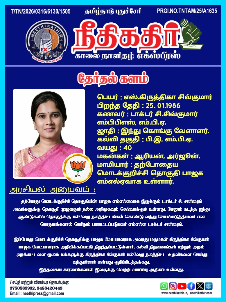 இப்போது மொடக்குறிச்சி தொகுதிக்கு பாஜக வேட்பாளராக அவரது மருமகள் கிருத்திகா சிவ்குமார் பாஜக வேட்பாளராக அறிவிக்கப்பட்டு நிறுத்தப்பட்டுள்ளார்.