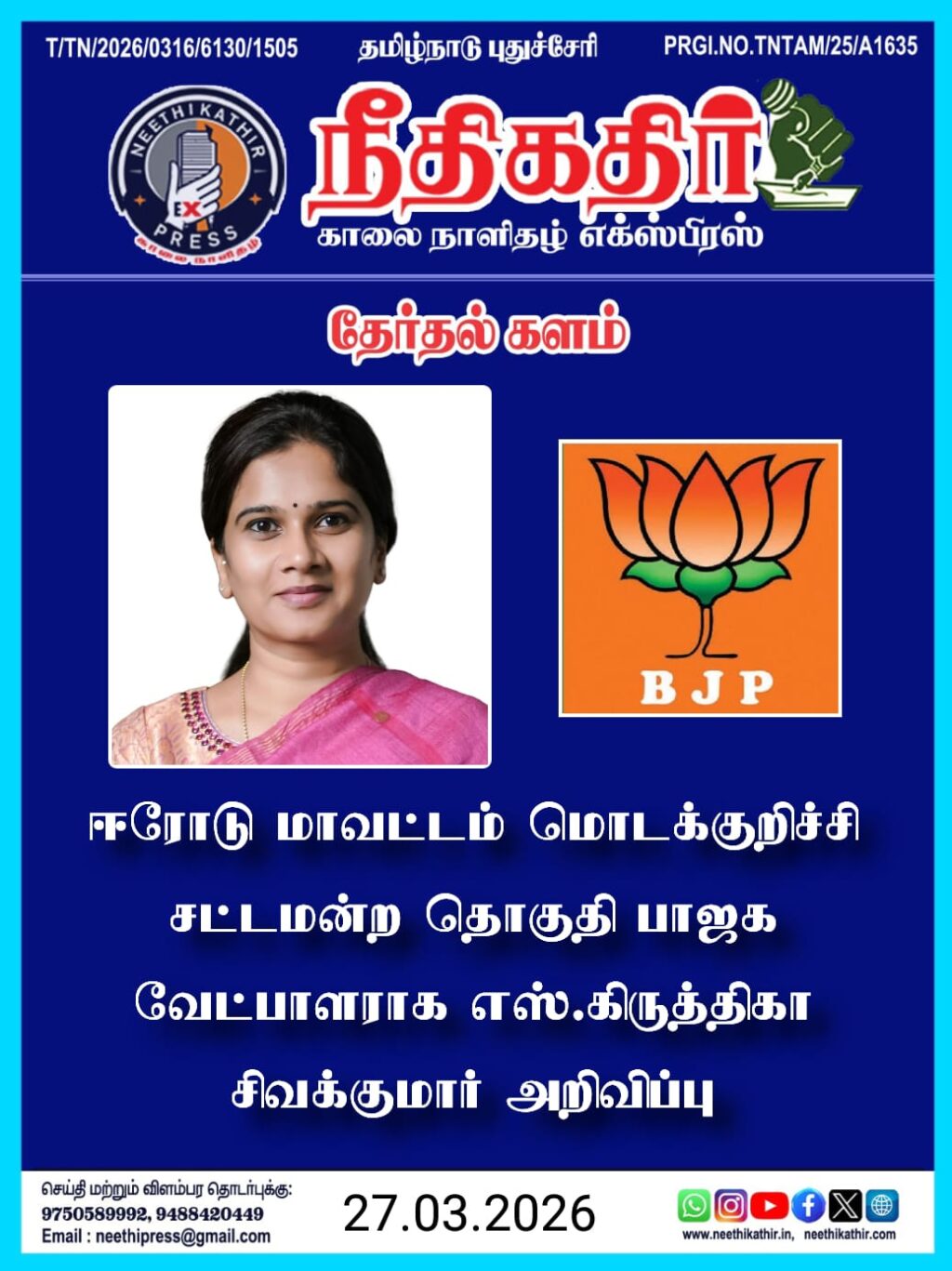 அப்போது மொடக்குறிச்சி தொகுதிக்கு பாஜக வேட்பாளராக அவரது மருமகள் கிருத்திகா சிவக்குமார் பாஜக வேட்பாளராக அறிவிக்கப்பட்டு நிறுத்தப்பட்டுள்ளார்.