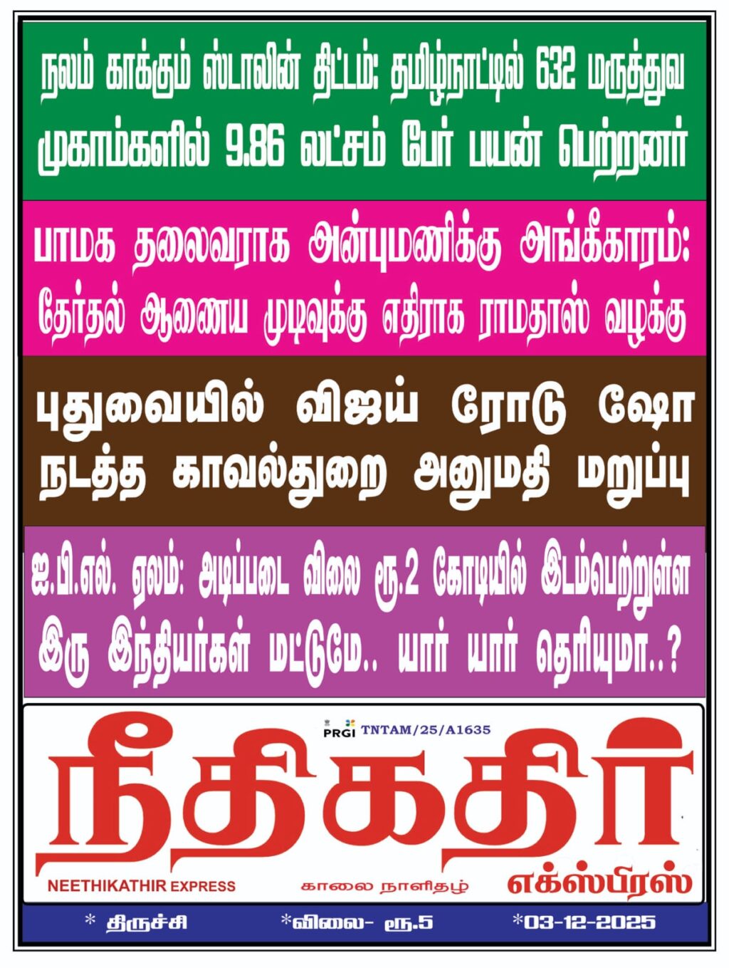 E-Paper 03-12-25 Post navigation Previous செய்தி சேகரித்த பத்திரிகையாளர்கள் மீது தாக்குதல்.!தமிழ்நாடு பத்திரிகையாளர் நலச்சங்கம் கடும் கண்டனம்Next Flash News More Stories E-Paper 26-02-26 E-Paper 25-02-26 E-Paper 24-02-26