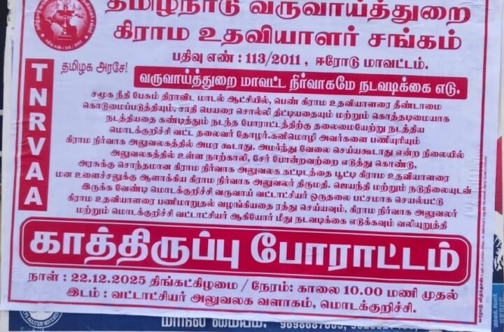 அதிகாரிகளுக்கு எதிராக இரண்டு நாட்களாக நடைபெறுகிறது… ஈரோடு. டிச. 24 ஈரோடு மாவட்டம் மொடக்குறிச்சி அலுவலக வளாகத்தில் கிராம...