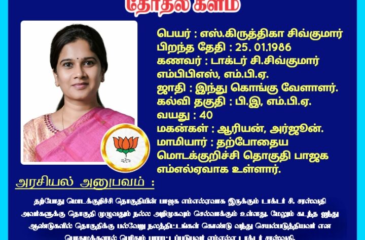 பெயர்= எஸ். கிருத்திகா சிவ்குமார். பிறந்த தேதி= 25/1/ 1986. கணவர் பெயர்= டாக்டர் சி. சிவ்குமார் எம்பிபிஎஸ்,,...