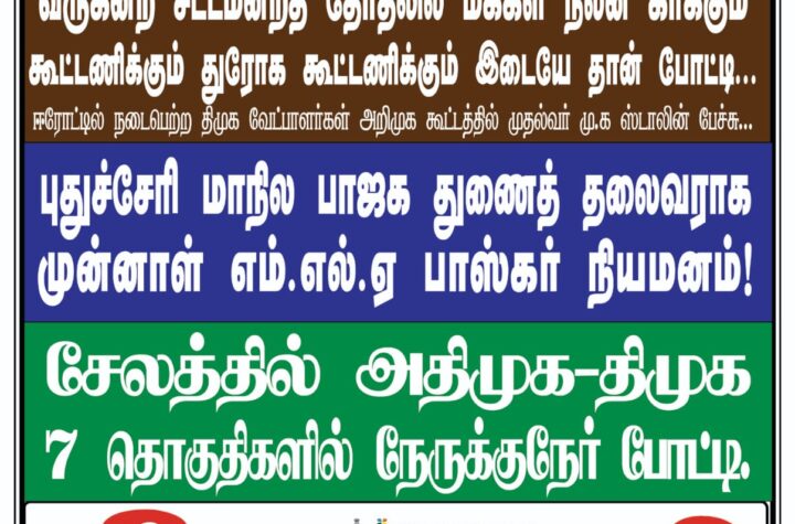 சேலத்தில் இபிஎஸ்’யை சந்தித்த வேட்பாளா்கள். சேலம் நெடுஞ்சாலை நகா் இல்லத்தில் எடப்பாடி கே.பழனிசாமியை அதிமுக,அதன் கூட்டணி கட்சி வேட்பாளா்கள்,...