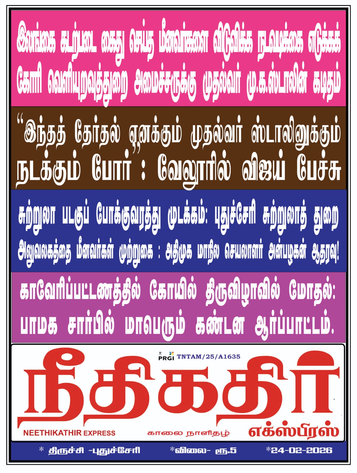 E-Paper 24-02-26 Post navigation Previous ஆர் எல் வி மக்கள் முன்னேற்றக் கழகத்தின் ஏனாம் தொகுதி நிர்வாகிகள் பட்டியல்ஆர் எல் வெங்கட்ராமன் வெளியிட்டார்.Next Next Post More Stories E-Paper 26-02-26 E-Paper 25-02-26 E-Paper 20-02-26