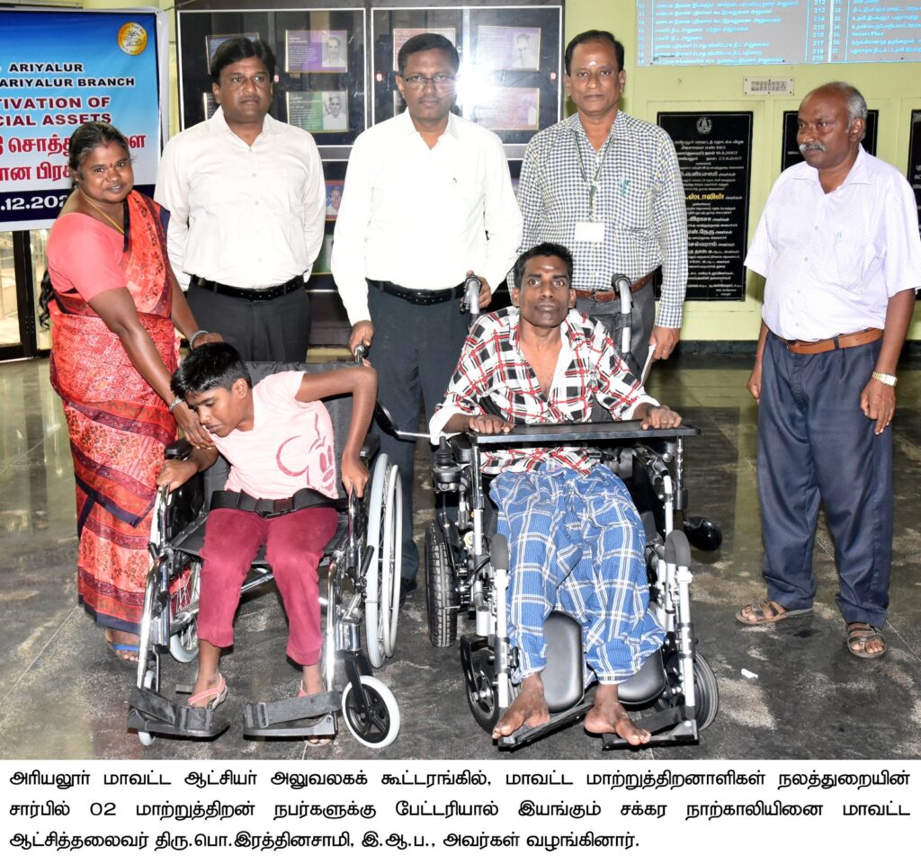 முன்னதாக மாவட்ட மாற்றுத்திறனாளிகள் நலத்துறையின் சார்பில் 02 மாற்றுத்திறன் நபர்களுக்கு பேட்டரியால் இயங்கும் சக்கர நாற்காலியினை மாவட்ட ஆட்சித்தலைவர் இரத்தினசாமி, வழங்கினார்.