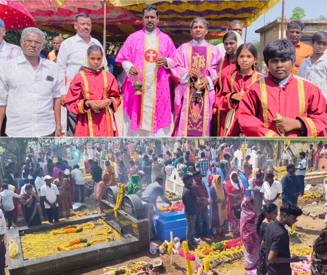 திருப்பலிக்குப் பிறகு, பங்குத் தந்தை ஏ. சிரில் அவர்கள் கல்லறைத் தோட்டத்திற்குள் சென்று, ஒவ்வொரு கல்லறையிலும் தீர்த்தம் தெளித்து, மந்திரித்து, ஆசீர்வாதம் வழங்கினார்.