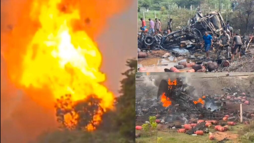 அரியலூர் – சிலிண்டர் ஏற்றி வந்த லாரி விபத்தில் லாரியில் இருந்த சிலிண்டர்கள் வெடித்து சிதறின
