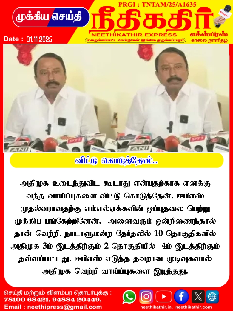 அரசியல் ஃபிளாஷ் நியூஸ் Flash News Post navigation Previous Flash NewsNext Flash News More Stories அரசியல் ஆர் எல் வி மக்கள் முன்னேற்றக் கழகத்தின் ஏனாம் தொகுதி நிர்வாகிகள் பட்டியல்ஆர் எல் வெங்கட்ராமன் வெளியிட்டார். 1 min read அரசியல் கொங்கு மண்டலத்தில் ஹாட் டாப்பிக் – சேலம் தவெக மீட்டிங்கில் செங்கோட்டையனுக்கு அவமரியாதையா!?. 1 min read அரசியல் பாரதிய ஜனதா கட்சி பிரச்சார பிரிவு சேலம் பெருங்கோட்டம் நடத்தும் பேச்சாளர்கள் பயிற்சி முகாம் சேலத்தில் சிறப்பாக நடைபெற்றது.