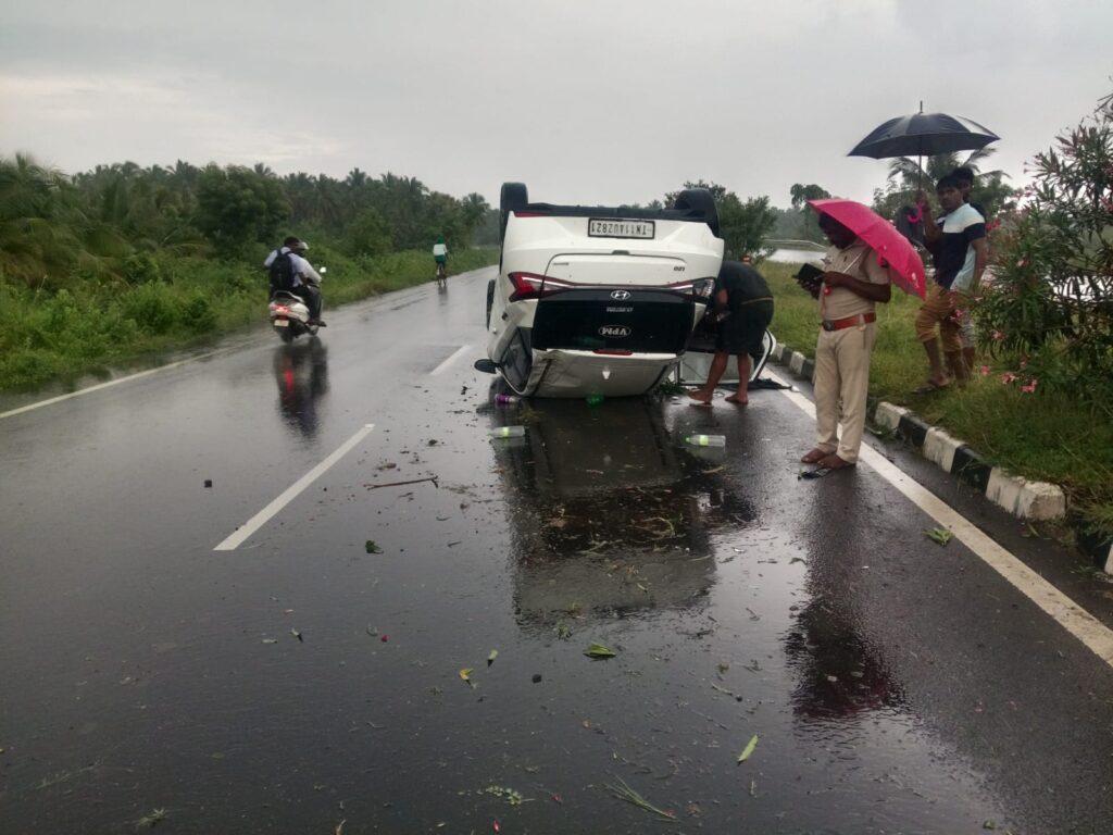 திருச்சி மாவட்டம் , துவரங்குறிச்சி அருகே கல்லுப்பட்டி சாய்பாபா கோவில் எதிரே குரோம்பேட்டை சேர்ந்த பூவாசகம் மகன் வேல்முருகன் ( 40 ) ஓட்டுநரான இவர் தனது நண்பர்களுடன் 19. 11. 2025 ம் தேதி தங்களது வீட்டில் இருந்து தனது நண்பர்களுடன் தனக்கு சொந்தமான TN 11 AU 28 21 Hyundai i20 என்ற பதிவில் கொண்ட நான்கு சக்கர வாகனத்தில் சபரிமலை சென்று விட்டு மீண்டும் இன்று குற்றாலத்தில் இருந்து புறப்பட்டு மதுரை -திருச்சி தேசிய நெடுஞ்சாலையில் துவரங்குறிச்சி காவல் நிலைய எல்லைக்குட்பட்ட கல்லுப்பட்டி சாய்பாபா கோவில் அருகில் சென்று கொண்டிருந்த போது மழை பெய்து கொண்டிருந்ததால் திடீரென நிலை தடுமாறி ஓட்டுனரின் கட்டுப்பாட்டை இழந்து கார் சாலையின் நடுவில் உள்ள சென்டர் மீடியனின் மோதி விபத்துக்குள்ளானதில் நான்கு சக்கர வாகனம் தலைக்குப்புற கவிழ்ந்ததில் அதிர்ஷ்டவசமாக லேசான காயங்களுடன் நான்கு சக்கர வாகனத்தில் பயணம் செய்த ஐயப்ப பக்தர்கள் உயிர்த்தப்பினர் விபத்து ஏற்பட்ட சம்பவ இடத்தில் போக்குவரத்து இடையூறுகள் ஏதுமில்லாமல் தவிர்க்கப்பட்டது ,மற்றும் தகவல் அறிந்து வந்த துவரங்குறிச்சி போலீசார் விபத்து தொடர்பாக விசாரணை செய்து வருகின்றனர்.
