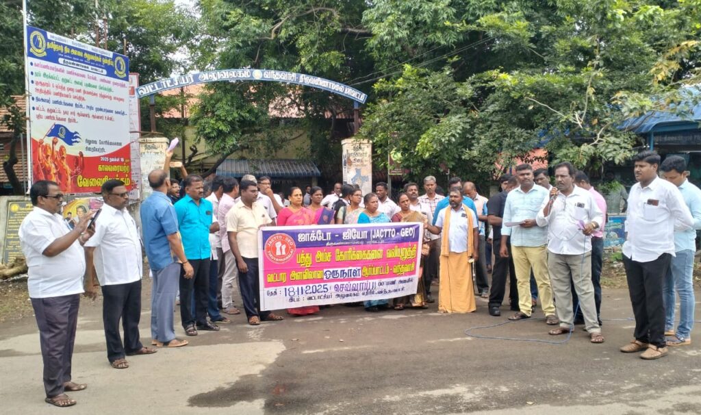 திருவண்ணாமலை மாவட்டம், வந்தவாசி வட்டாட்சியர் அலுவலகம் எதிரே ஜாக்டோ ஜியோ அரசு ஊழியர்கள் 10 அம்ச கோரிக்கைகளை வலியுறுத்தி கண்டன ஆர்ப்பாட்டத்தில் ஈடுபட்டனர். இதில் பழைய ஓய்வூதிய திட்டத்தை மீண்டும் அமல்படுத்த வேண்டும், ஆசிரியர் தகுதித் தேர்வை ரத்து செய்ய வேண்டும் உள்ளிட்ட பல்வேறு முழக்கங்கள் எழுப்பப்பட்டன. இந்த ஆர்ப்பாட்டத்தில் ஜாக்டோ ஜியோ நிர்வாகிகள் சபரிராஜ், க.வாசு, செந்தில்குமார், ராஜேஷ், இப்ராகிம், ரகுபாரதி, ஆசிரியைகள் சாந்தி, மணிமேகலை மற்றும் மேனாள் சங்க மாநில பொறுப்பாளர் கேப்டன் பிரபாகரன் உள்ளிட்ட ஆசிரியர்கள் மற்றும் அரசு அலுவலர்கள் ஏராளமானோர் பங்கேற்றனர்.