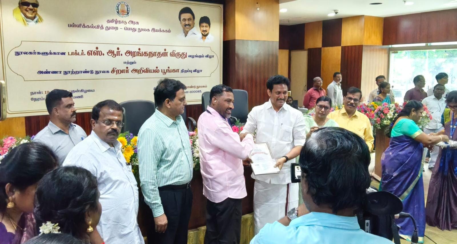 சென்னை அண்ணா நூற்றாண்டு நூலகத்தில் பள்ளி கல்வித்துறை மற்றும் பொது நூலக இயக்கம் சார்பில் நடைபெற்ற விழாவில் திருவண்ணாமலை மாவட்டம், சி.ம.புதூர் கிளை நூலகர் ஜா.தமீம் அவர்களுக்கு சிறந்த நல்நூலகருக்கான டாக்டர் எஸ்.ஆர். அரங்கநாதன் விருதை கல்வி அமைச்சர் அன்பில் மகேஷ் வழங்கினார். இந்த விழாவில் பொது நூலக இயக்குநர் ஜெயந்தி, பள்ளி கல்வித்துறை முதன்மை செயலாளர் சந்திரமோகன், திருவண்ணாமலை மாவட்ட நூலக அலுவலர் பெ. வள்ளி ஆகியோர் பங்கேற்று வாழ்த்துரை வழங்கினர்.
