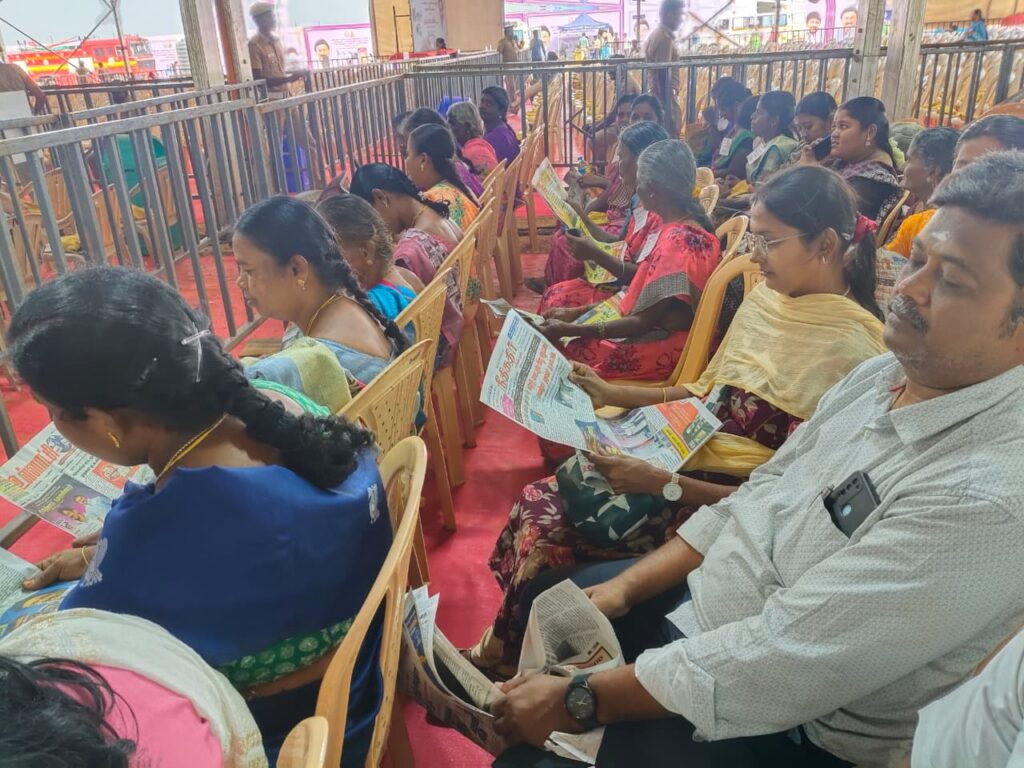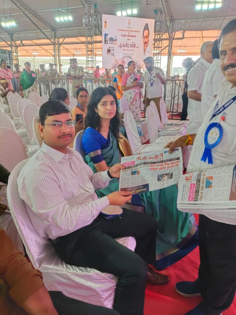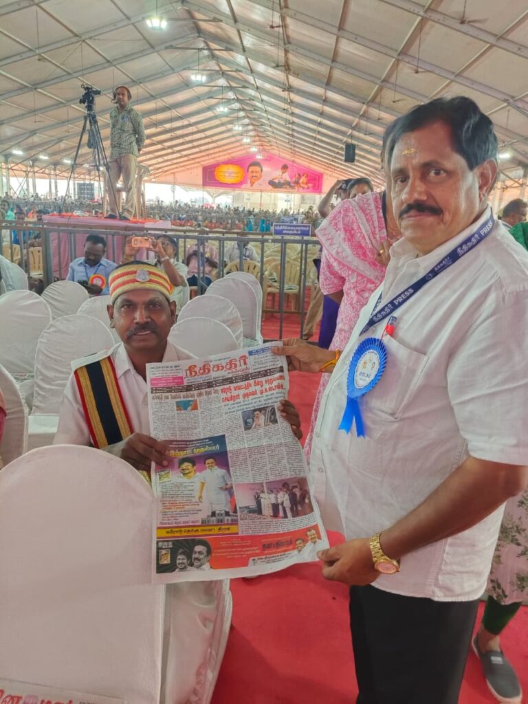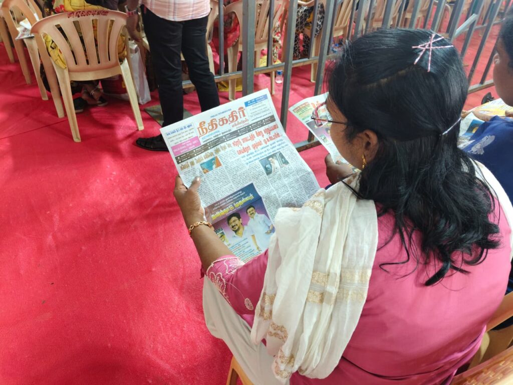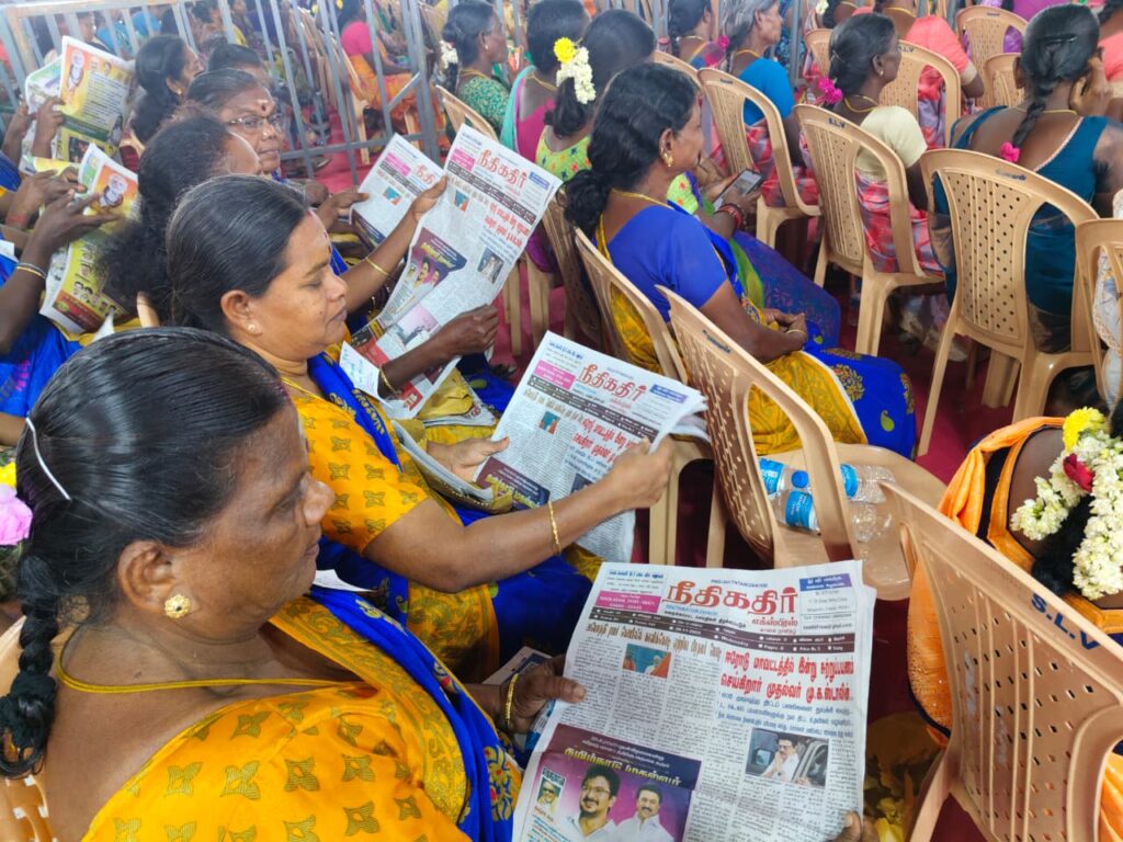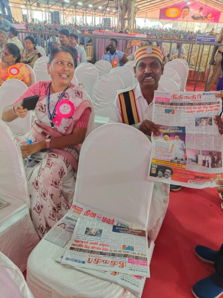ஈரோட்டில் நடைபெற்ற தமிழக முதல்வர் மு க ஸ்டாலின் கலந்து கொண்ட அரசு விழாவில் நமது நீதி கதிர் எக்ஸ்பிரஸ் நாளிதழை ஆர்வமுடன் வாங்கி படிக்கும் பொதுமக்கள்.