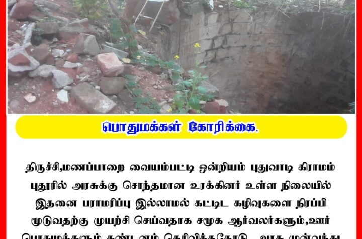 திருச்சி மாவட்டம் மணப்பாறை வட்டம் வையம்பட்டி ஒன்றியம் புதுவாடி கிராமம் புதூரில் அரசுக்கு சொந்தமான உறக்கினர். உள்ளதாகவும் இதனை...