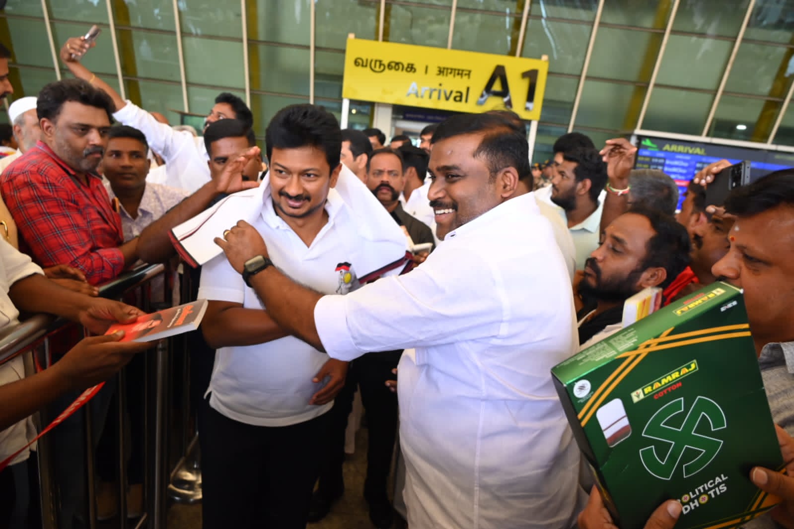 ஈரோடு மாவட்டத்தில் பல்வேறு நிகழ்ச்சிகளில் கலந்து கொள்ள, கோவை விமான நிலையம் வந்திருந்த, தமிழ்நாடு துணை முதலமைச்சர், திமுக இளைஞரணி செயலாளருமான உதயநிதி ஸ்டாலினை, கோவை விமான நிலையத்தில் ஈரோடு தெற்கு மாவட்ட திமுக இளைஞரணி அமைப்பாளர் ஜெ. திருவாசகம் பொன்னாடை அணிவித்து புத்தகம் வழங்கி வரவேற்றார்.