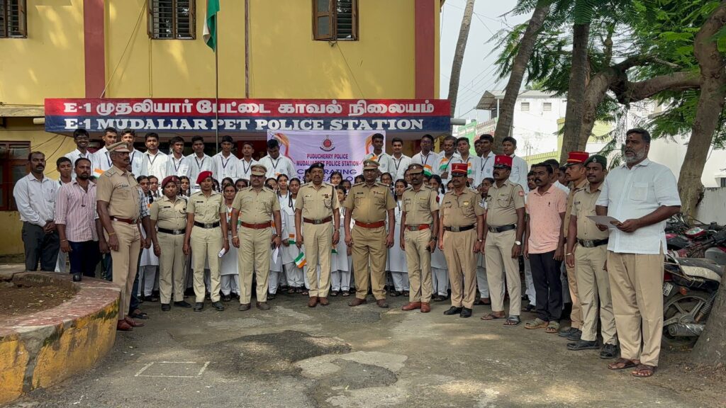 150-ஆவது வந்தே மாதரம் விழாவை முன்னிட்டு, புதுச்சேரி முதலியார்பேட்டை காவல் நிலையத்தில் வெள்ளிக்கிழமை (நவம்பர் 7, 2025) பள்ளி மாணவர்களின் தேசபக்திப் பாடல் முழக்கத்துடன் கோலாகலமான விழா நடைபெற்றது.