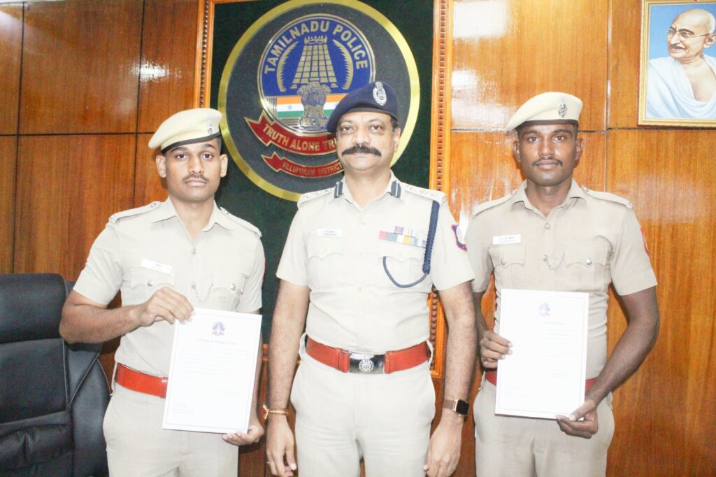 மேல்மலையனூர் அங்காளம்மன் ஆலயத்தில் வெகு சிறப்பாக நடைபெற்ற அமாவாசை ஊஞ்சல் உற்சவத்தின் போது பக்தர் தவறவிட்ட தங்க நகைகளை பாதுகாப்பு பணியில் இருந்த சிறப்பு காவல்படை காவலர்கள் சதீஷ் மற்றும் தர்மதுரை ஆகியோர் கையில் கிடைத்துள்ளது. இதனை உரியவரிடம் ஒப்படைக்க மேல்மலையனூர் காவல் ஆய்வாளர் வினிதா அவர்களிடம் ஒப்படைத்த காவலர்களின் நேர்மையினை மாவட்ட காவல் கண்காணிப்பாளர் சரவணன் IPS., அவர்கள் நேரில் அழைத்து நற்சான்று கொடுத்து பாராட்டினார்.